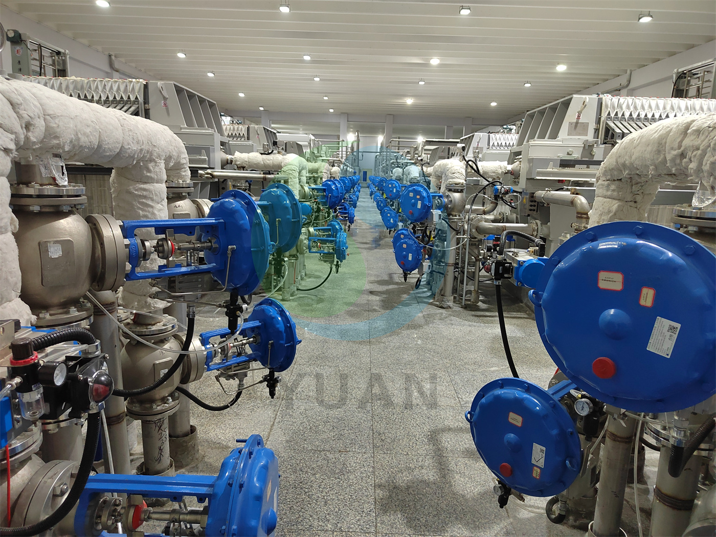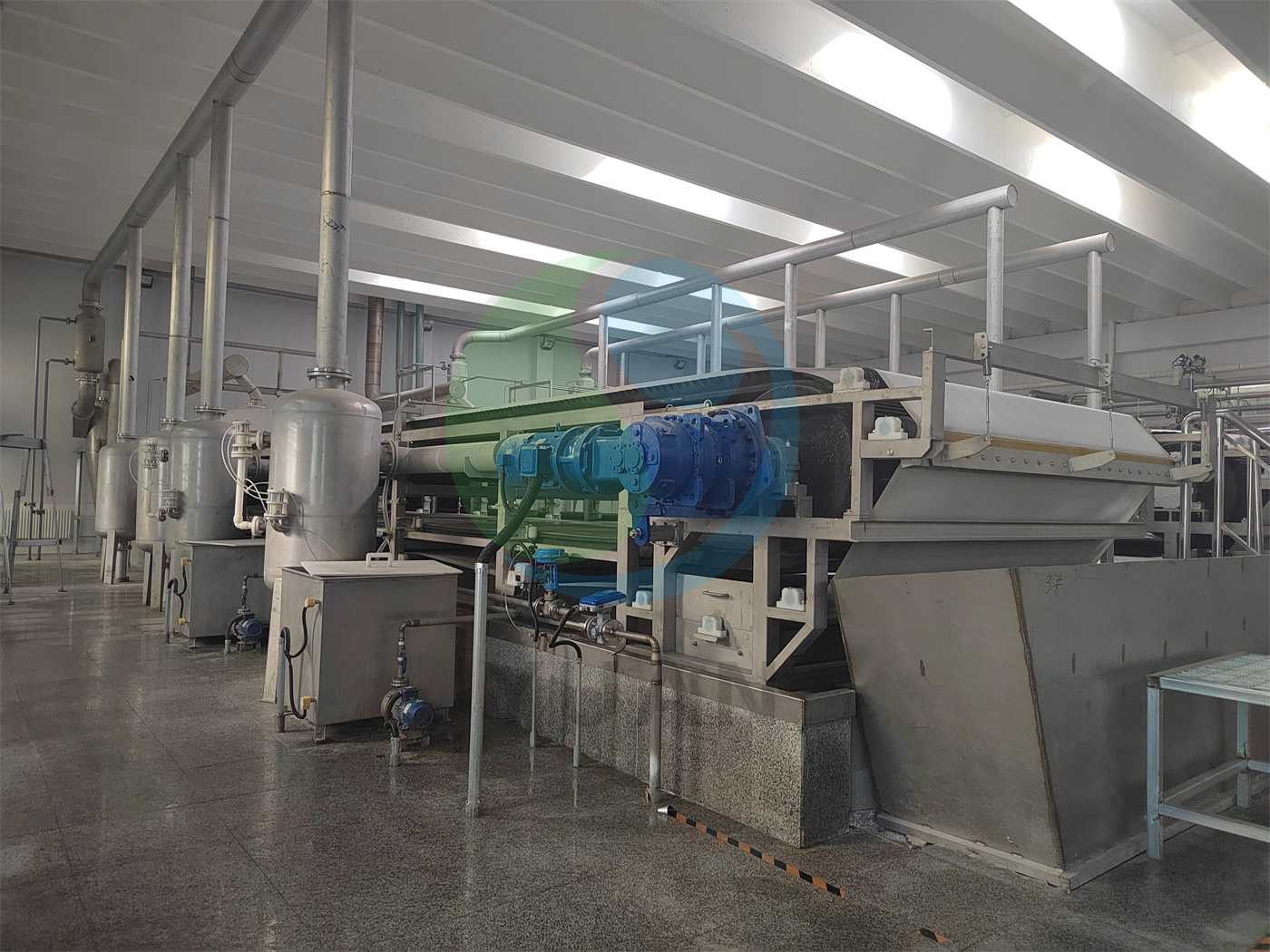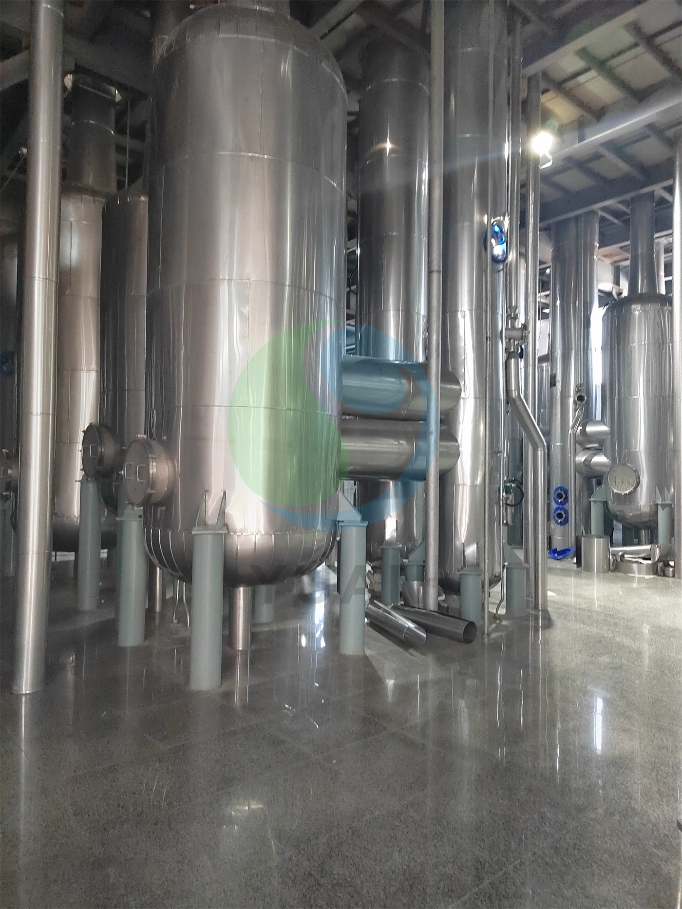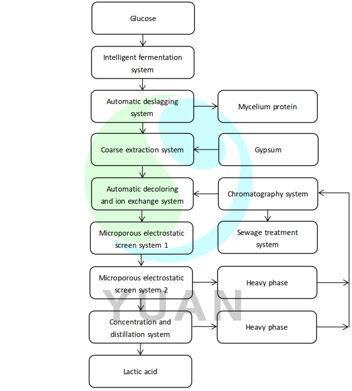 Die qualifizierte Glukose nach dem Batching- und Eliminierungssystem tritt in das Fermentationssystem ein, um eine bestimmte Fermentationszeit aufrechtzuerhalten, und geht dann in das Filtrationsentfernungssystem ein, um das grobe Protein zu entfernen. Nachdem die Fermentationsbrühe konzentriert ist, tritt sie in das Acidolyse -System von Calciumlaktat ein. Nach der Filterung von CASO4 durchläuft es das kontinuierliche Isolationssystem zur Entfärbung, Deodorisierung und Entspannung. Nach der Verfeinerung tritt es in das Membranfiltrationssystem, das Konzentrations- und Reinigungssystem ein, um das qualifizierte L-Milchsäureprodukt zu erhalten.