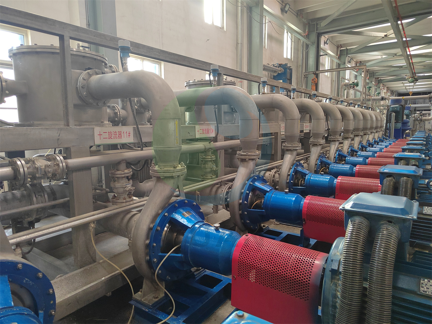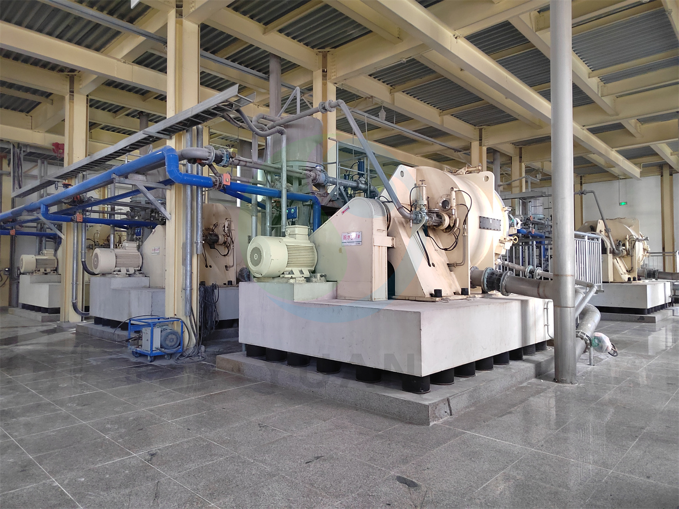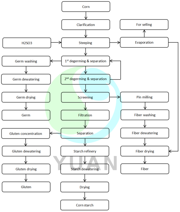 Die grobe Stärkmilch, die in den Abschnitt zwischen Stärke getrennt ist, geht durch den Desander- und Rotationsfilter, um die Verunreinigungen zu entfernen. Geben Sie dann den Hauptabscheider ein, um Stärke und Protein zu trennen. Nach der Trennung gelangt das Trennwasser des oberen Flusses in den Proteinkonzentrator. Die Unterlaufmilch tritt für die Gegenstromwäsche in den 12-stufigen Hydrocyclon ein und dann zur Entwässerung zur Schälerzentrifuge. Die dehydrierte Nassstärke tritt durch den Förder- und Winnow -Maschine zum Trocknen in das Stärkelufttrockner und erhält dann die qualifizierte Maisstärke mit DS ≥ 86% für das Verpacken.
