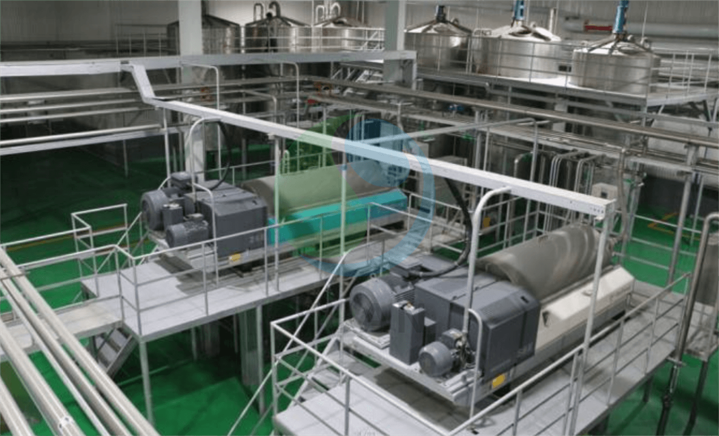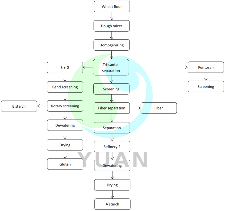 Das Weizenmehl mischt sich durch den Teigmischer durch Zugabe von Wasser und tritt dann zur Homogenisierung in den Homogenisator ein, so dass der Teig reifen und Protein schnell kondensiert, um Stärke und Protein zu trennen. Nach der Homogenisierung tritt die Mehlpaste in den Tri-Canter ein, und die leichte Phase, die zweite schwere Phase und die schwere Phase sind getrennt. Die Lichtphase ist das lösliche Pentosan. Die zweite Phase ist B -Stärke, Gluten und eine kleine Menge Faser. Die schwere Phase ist hauptsächlich eine Stärke und Faser. Die zweite Phase wird vom ARC -Bildschirm gesiebt und dann vom Rotationsbildschirm gewaschen, um den unteren Fluss B -Stärke und eine kleine Menge Faser sowie das Gluten auf dem Bildschirm zu erhalten. Das Gluten wird vom Quietschen dehydriert und vom Gluten -Trockner getrocknet, dann wird das qualifizierte Glutenprodukt erhalten. Der untere Fluss verläuft durch das Zentrifugalsieb, um die B -Stärke und die Faser zu trennen, und trennt nach der Trennung die gemischte kleine Menge einer Stärke. Nachdem die raffinierte B -Stärke dehydriert und getrocknet ist, wird das B -Stärkeprodukt erhalten. Die durch den Tri-Kanter getrennte A-Stärke und Faser, die von B-Stärke getrennte Faser und die von der B-Stärke getrennte Stärke werden gemischt, und die Faser wird durch das Zentrifugalsieb getrennt, und dann tritt die Stärkemilch in den Separator für das ein Weitere Trennung. Die getrennte Stärke durchläuft durch die Raffinerie, die Entwässerung und Trocknung und erhält dann die qualifizierte Stärke.